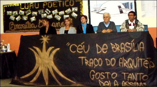 Cena final com todos os homenageados, vencedores do concurso de poesia e organizadores no palco do CEM 404 de Santa Maria, DF. O Cel´gio é dirigido por Marco AntÕnio F. Sobrinho e a sub-direação é da Profa. Itacelma Fonseca Correa.