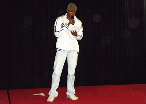 O estudante Rodrigo José B. Amorim fazendo a apresentação da biografia de Antonio Miranda.