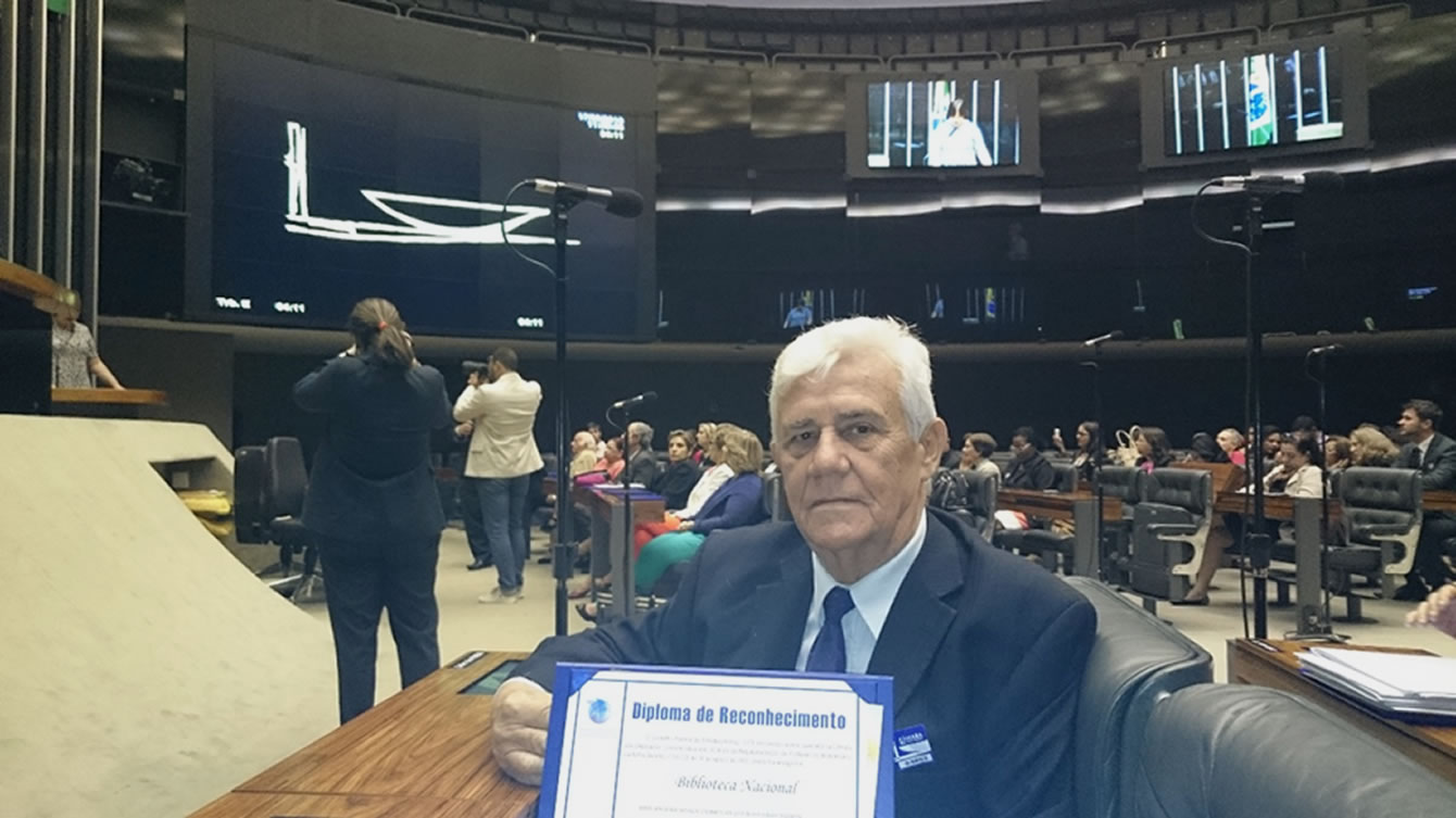 Na foto, o bibliotecário Antonio Miranda, diretor da Biblioteca Nacional de Brasília recebeu um diploma em homenagem à referida biblioteca pelos serviços prestados à cultura do brasileira.