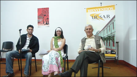 Lectura de poemas en el auditorio de la Universidad Católica Santa Rosa, en Caracas: Antonio Miranda con los poetas venezolanos y Merlivé Monsalve y Juanybal Reyes .