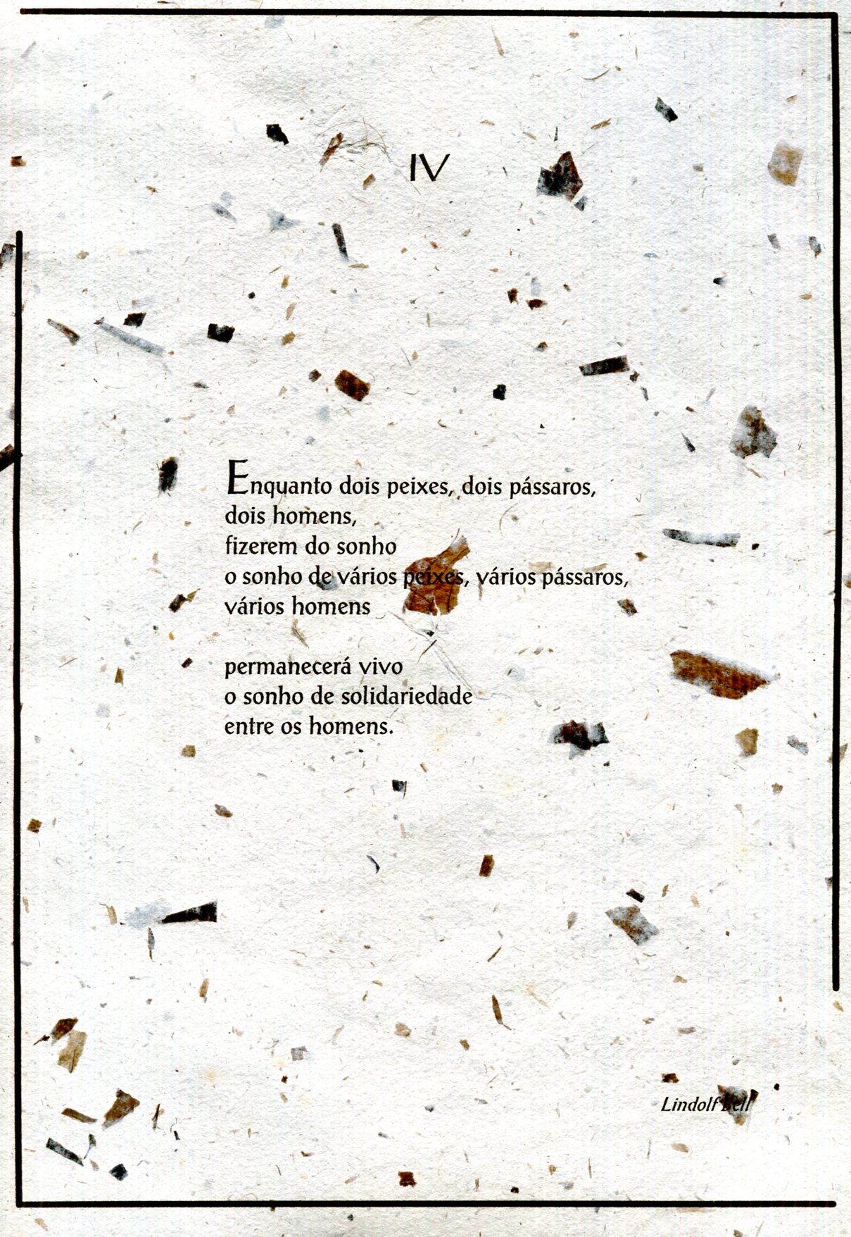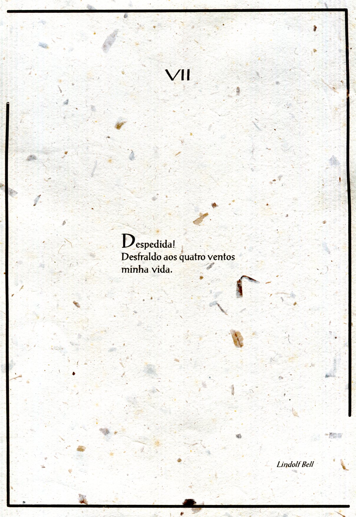 BELL, Lindolf. PRÉ-TEXTOS PARA UM FIO DE ESPERANÇA. Florianópolis, SC: 1994. Coordenação editorial: NEUSA Maria Bardi. Caixa de papelão contendo 14 folhas soltas com poema. Papel feito a Mão Terra com fibra de cebola. Tiragem 750 exs. 24 x 32,5 cm.