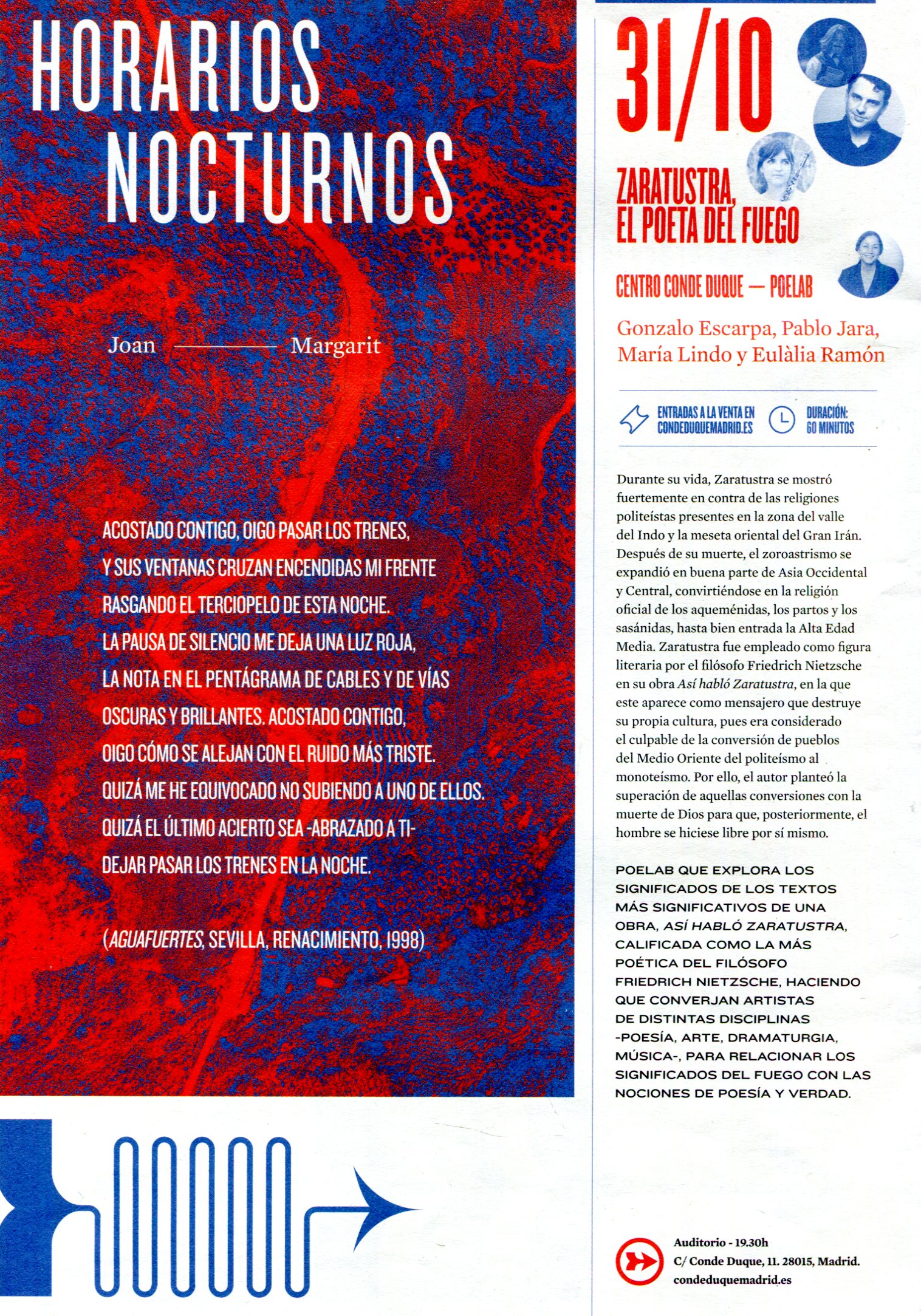 Joan Margarit (Sanaüja, Lleida, 1938), poeta e arquiteto catalão, último galardoado com o Prêmio Rainha Sofia de Poesia Iberoamericana, também já recebeu os prêmios Nacional de Poesia, Rosália de Castro e Jaume Fuster, além de diversos outros, tais como o Prêmio Poetas do Mundo Latino, concedido no México. O júri do Prêmio Rainha Sofia, que foi presidido pela poeta Ida Vitale, ressaltou que sua poética prima pela "transcendência profunda" e pela pluralidade da cultura peninsular que representa. Trata-se do poeta catalão vivo mais lido. Herdeiro da poesia clara e difícil de Salvador Espriu e da poesia bondosa e intensa de Miquel Marti i Pol.
