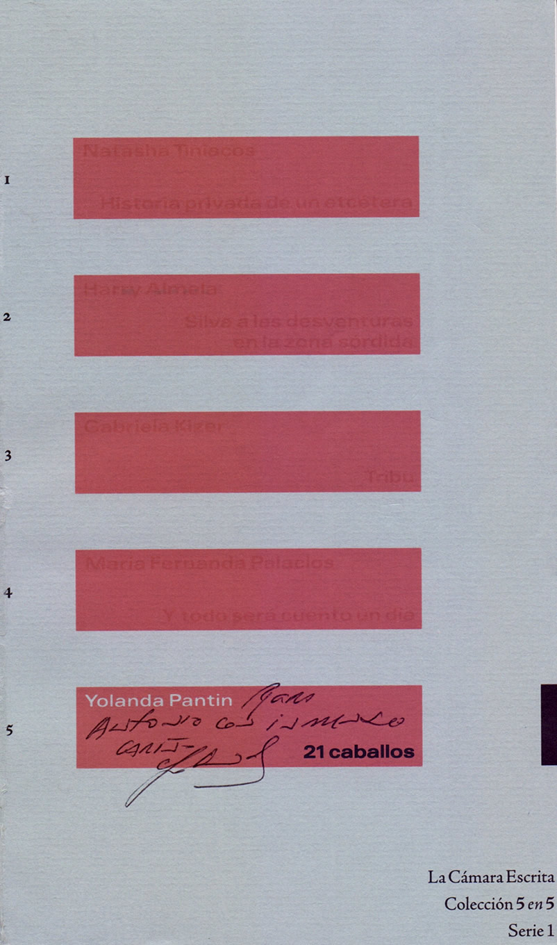 LA CÁMARA ESCRITA. Colección 5 em 5. Caracas: Editorial Ex-Libris, 2011. Caja de papelón con 5 volúmenes de los poetas Natasha Tiniacos: Historia privada de un etcétera, Harry Almela: Silva a las desventuras en la zona sórdida, Gabriel Kizer: Tribu , Maria Fernanda Palacios: Y todo será cuento un día, Yolanda Pantin: 21 caballos. 14x23,5 cm