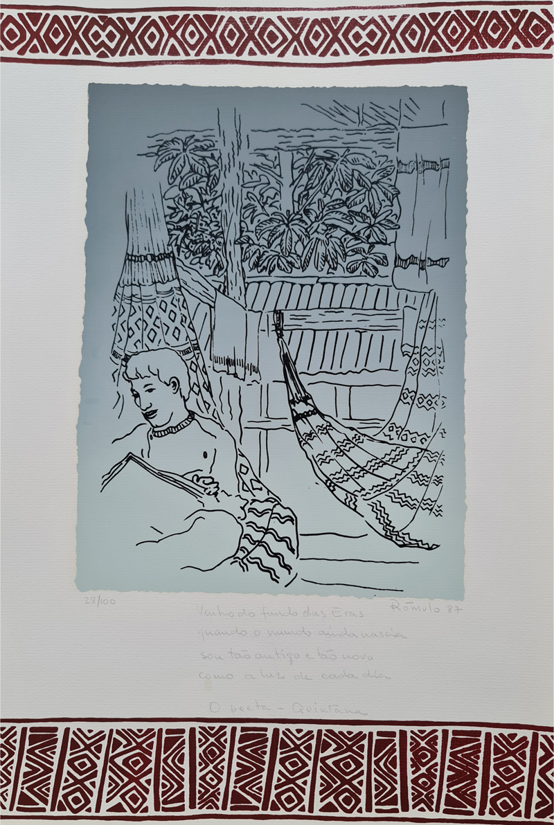 ANDRADE, Rômulo. Artistas pela natureza. Brasília: 1987. Silk printing. Folio com capa em papel artesanal por Cecílis Segré. 34,5x48 cm. Edição de 100 exs. 6 gravuras numeradas e assinadas pelo artista plástico Rômulo e haikais de Roberto Evangelista escritos a lápis e assiandos pelo autor na parte final de cada uma das seis gravuras. Coleção exibida pelo Center for Book Arts, New York em diversas mostras itinerantes –Latins American Book Arts nos Estados Unidos e Canadá. Livro de arte.