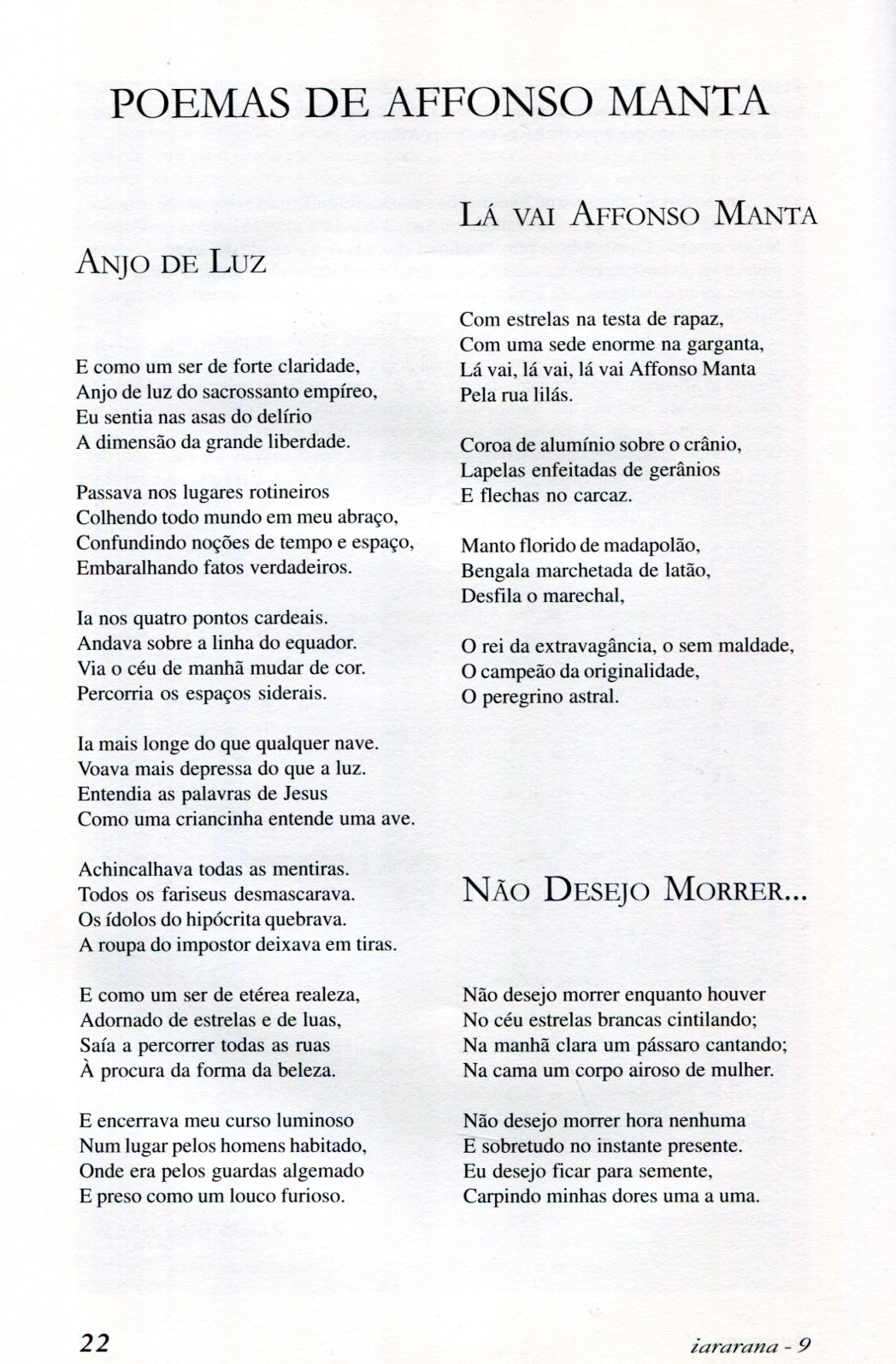 A poesia de Affonso Manta é marcada de profundo lirismo, oscilando (como dividi a antologia que dele organizei e foi lançada no ano passado) entre a poética confessional, a amorosa, a de temática variada e a de cunho religioso ou místico. Minha amizade com o poeta começou na juventude: eu com treze ou catorze anos, ele com dezesseis ou dezessete. Todas as tardes nos sentávamos no coreto do jardim de Poções, ao lado da velha Matriz, perto da qual ele viveu grande parte da vida, e conversávamos até depois do crepúsculo. Ou, mais exatamente, ele falava e eu escutava — maravilhado com aquele rapaz que já tinha lido tanto e se referia desenvoltamente a ficcionistas, filósofos, sobretudo a poetas e poesia.
