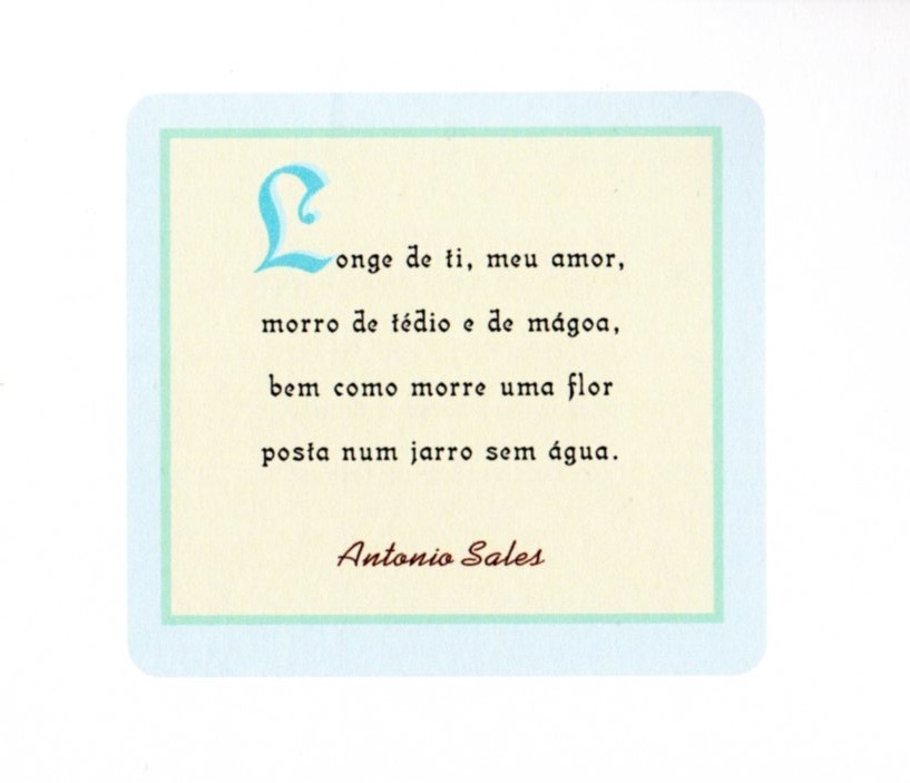/ Caixa de cartão duro com 12 conjuntos de poemas, um para cada mês do ano. Os poetas incluídos pelo mês de seu aniversário. Inclui efígie e um poema de cada poeta, escolhidos entre os clássicos e os contemporâneos do Brasil, e alguns de Portugal. Produção artesanal.