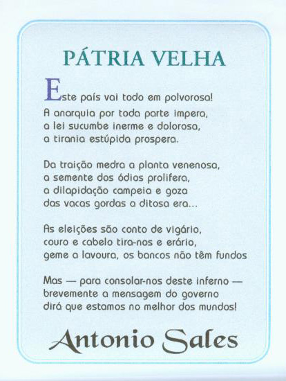 “Fóra do Sério” é o titulo por êle escolhido por um livro contendo os epigramas e as sátiras que andou perpetrando por êstes Brasis. Eis, a seguir, algumas amostras da musa cômica de SALES: