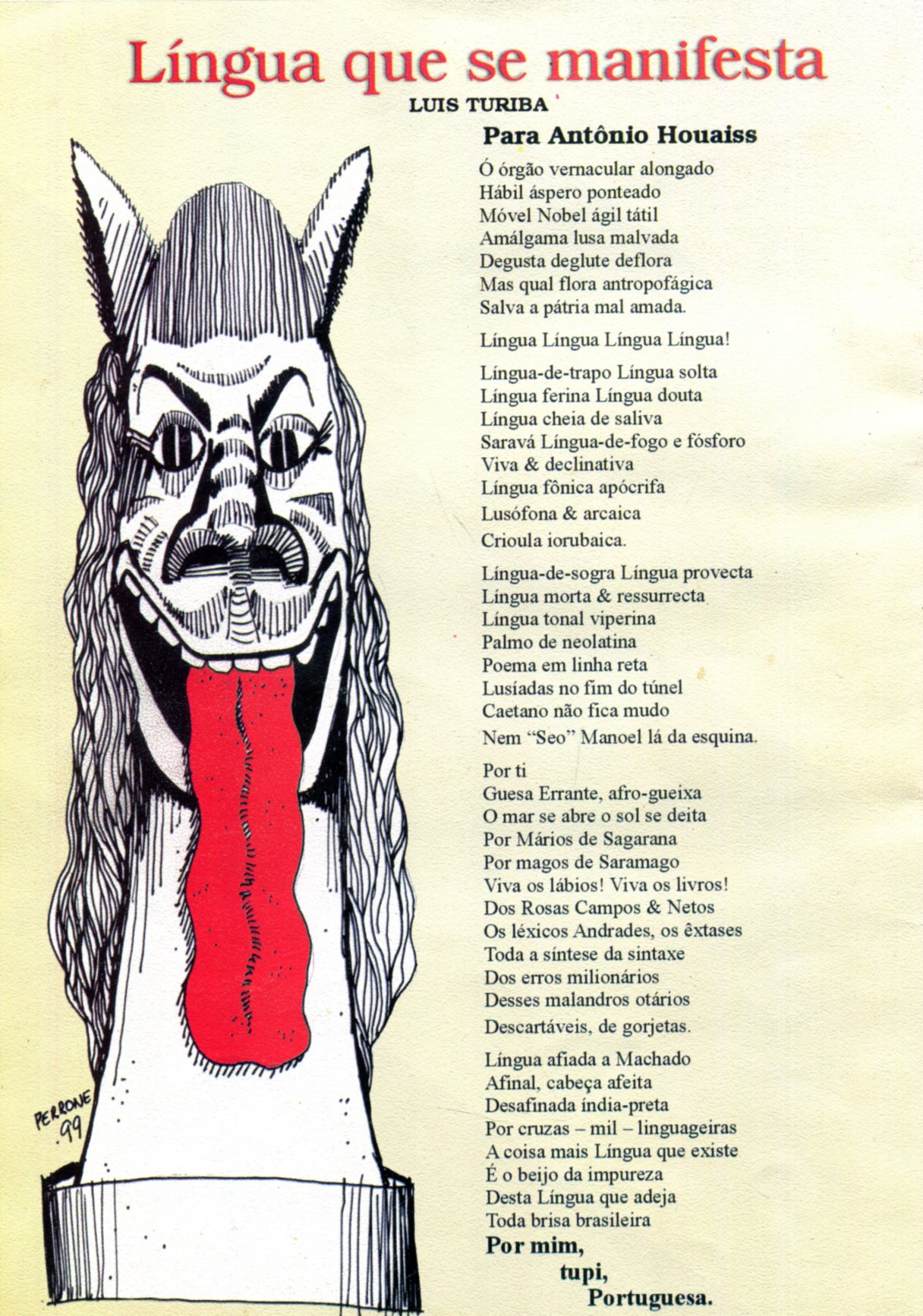Ó órgão vernacular alongado Hábil áspero ponteado Móvel Nobel ágil tátil Amálgama lusa malvada Degusta deglute deflora Mas qual flora antropofágica Salva a pátria mal amada Língua-de-trapo Língua solta Língua ferina Língua douta Língua cheia de saliva Savará Língua-de-fogo e fósforo Viva & declinativa Língua fônica apócrifa Lusófona & arcaica Crioula iorubaica. Língua-de-sogra Língua provecta Língua morta & ressurecta Língua tonal viperina Palmo de neolatina Poema em linha reta Lusíadas no fim do túnel Caetano não fica mudo Nem “Seo” Manoel lá da esquina Por ti Guesa Errante, afro-gueixa O mar se abre o sol se deita Por Mários de Sagarana Por magos de Saramago Viva os lábios! Viva os livros! Dos Rosas Campos & Netos Os léxicos Andrades, os êxtases Toda a síntese da sintaxe Dos erros milionários Desses malandros otários Descartáveis, de gorjetas. Língua afiada a Machado Afinal, cabeça afeita Desafinada índia-preta Por cruzas mil linguageiras A coisa mais Língua que existe É o beijo da impureza Desta Língua que adeja Toda a brisa brasileira Por mim Tupi, Por tu Guesa