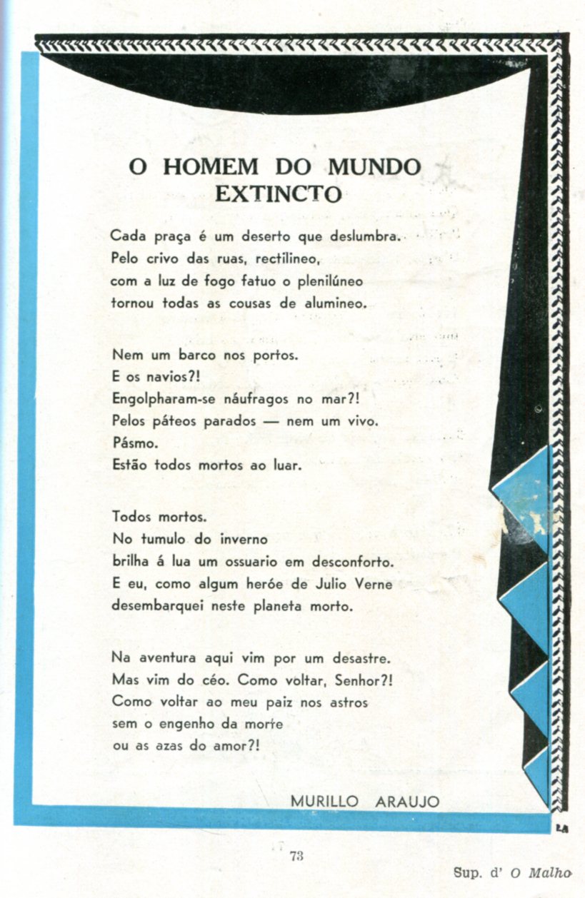 O Poeta Murillo Araujo [ também aparece grafado, equivocamente, como Murilo Araujo ] nasceu na cidade de Serro, Minas Gerais, Brasil, em 26 de outubro de 1894. Ele é um dos expoentes do Modernismo. Estreou em 1917, com o livro Carrilhões -cinco anos antes da Semana de Arte Moderna, evento do qual participou-. Seguiram-se a este livro A galera (escrito em 1915, mas publicado anos depois), Árias de muito longe (1921), A cidade de ouro (1927), A iluminação da vida (1927), A estrela azul (1940) -esta obra foi traduzida pelo poeta uruguaio Gaston Figueira para o espanhol com o nome La Estrela Azul e publicada em Nova York (EUA)-, As sete cores do céu (1941), A escadaria acesa (1941), O palhacinho quebrado, A luz perdida (1952) e O candelabro eterno (1955). A obra em prosa limita-se a quatro livros: A arte do poeta (1944), Ontem, ao luar (1951), uma biografia do compositor Catulo da Paixão Cearense, Aconteceu em nossa terra (pequenos casos de grandes homens) e Quadrantes do Modernismo Brasileiro (1958). Murillo Araujo também traduziu o livro O inspetor geral, do escritor russo Nikolai Gogol (Sorotchintsi, 1809 – Moscou, 1852).