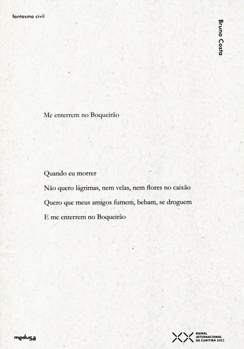 FANTASMA CIVIL. XX Bienal Internacional de Curitiba 2013. Organização Ricardo Corona. Curitiba, PR: Fundação Cultural de Curitiba, 2013. 43 cartões com imagens aéreas de Curitiba e, no reverso, versos de poetas paranaenses. Projeto gráfico Medusa. Obra inconsútil. ISBN 978-85-64029-08-8 Inclui os poetas: Josely Vianna Batista, Lindsey R. Lagni, Ademir Demarchi, Luci Collin, Fernando José Karl, Roberto Prado, Sabrina Lopes, Bruno Costa, Amarildo Anzolin, Carlos Careqa, Roosevelt Rocha, Camila Vardarac, Marcelo Sandmann, Vanessa C. Rodrigues, Anisio Homem, Greta Benitez, Ivan Justen Santana, Mario Domingues, Marcos Prado, Bianca Lafroy, Estrela Ruiz Leminski, Sérgio Viralobos, Alexandre França, Helena Kolody, Wilson Bueno, Paulo Leminski, Alice Ruiz, Zeca Corrêa Leite, Édson De Vulcanis, Afonso José Afonso, Homero Gomes, Leonardo Glück, Hamilton Faria, Emerson Pereti, Andréia Carvalho, Ricardo Pedrosa Alves, Priscila Merizzio, Marcelo De Angelis, Adalberto Müller, Cristiane Bouger.
