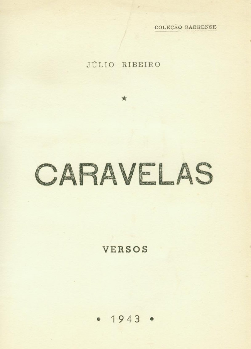 RIBEIRO, Julio. Caravelas. Versos. Barra do Pirái, RJ: Of. Gráficas da Prefeitura Municipal de Barra do Piraí, 1943. 92 p (Coleção Barrense) 17x24 cm. Encadernado sem a capa. “ Julio Ribeiro “ Ex. bibl. Antonio Miranda