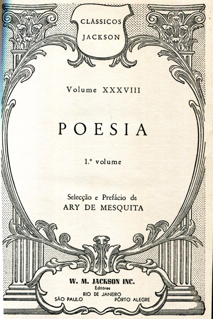 POESIA – 1º. Volume. Seleção e prefacio de Ary de Mesquita. Rio de Janeiro: W. M. Jackson Inc., 1952. 392 p. (Clássicos Jackson, volume XXXVIII) capa dura.