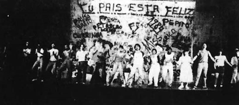 La puesta en escena de TU PAÍS ESTA FELIZ está sostenida por el juego de los actores sobre el escenario. El recurso principal son sus propios cuerpos y voces transformándose en hogar, autobús, campo de batalla, canos y río. El trabajo es simple, sin mayores artificios. Se usarán maderas y trapos blancos como banderas improvisadas sobre la misma escoba. Presidiendo todo, un muñeco gigante vestido de sotana verde, con casco militar y levantando una mano a manera del saludo fascista.