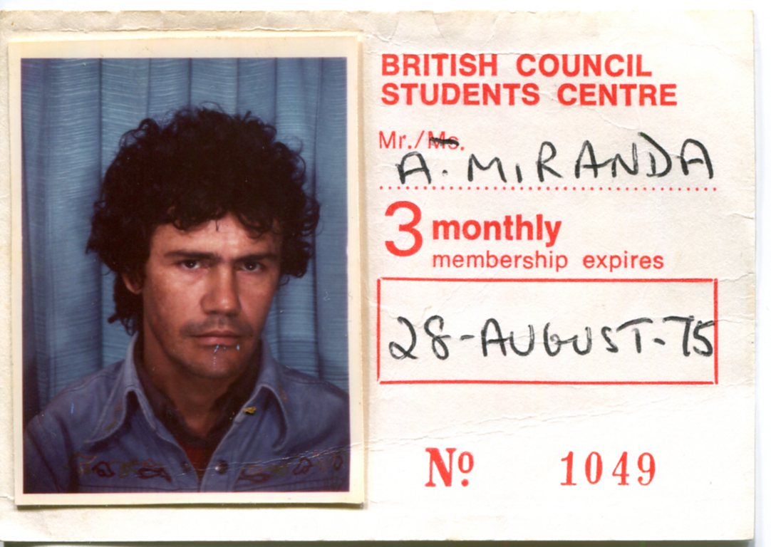 Antonio Miranda auto-exilou-se na Venezuela em 1966, durante o período mais duro da ditadura no Brasil, e só regressou em 1973. Foi bolsista e estudante de Bibliotecología na Universidad Central de Venezuela (onde chegou a ser preso por pouco tempo, no mesmo “allanamiento” da referida universidade, e esteve preso, e foi deportado, o grande brasileiro Darcy Ribeiro, a quem atendia como colaborador. Na imagem acima, a carteira de identidade de estrangeiro, já na fase final de sua permanência no país.